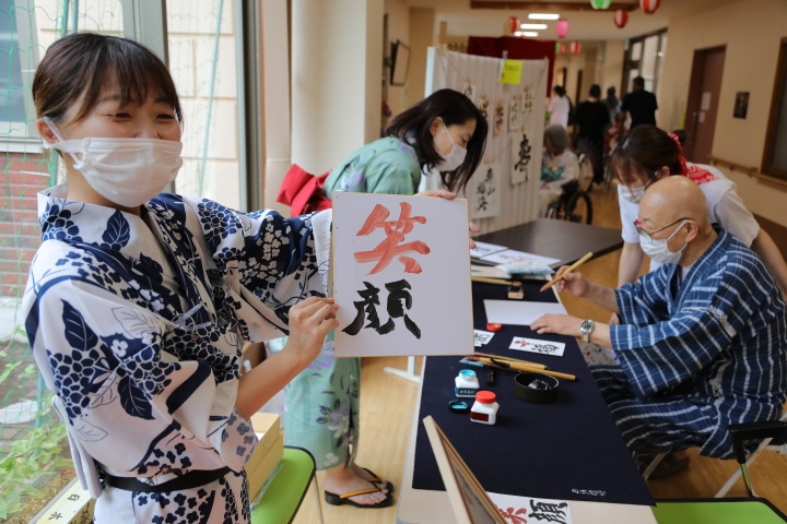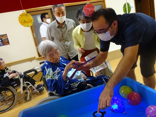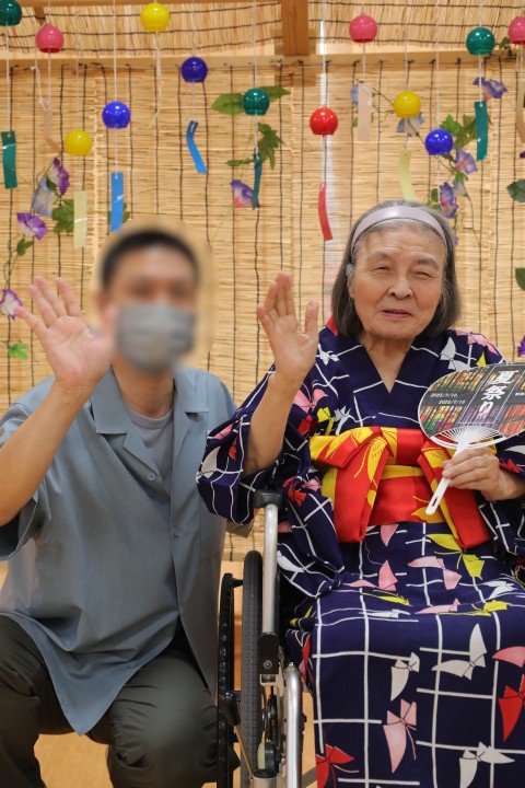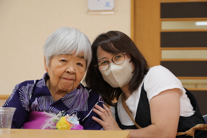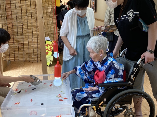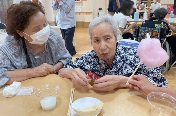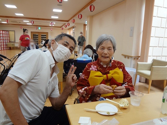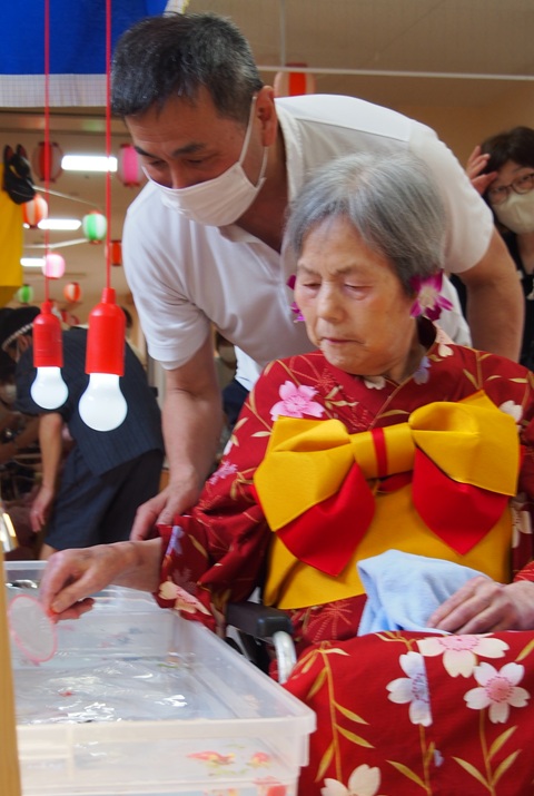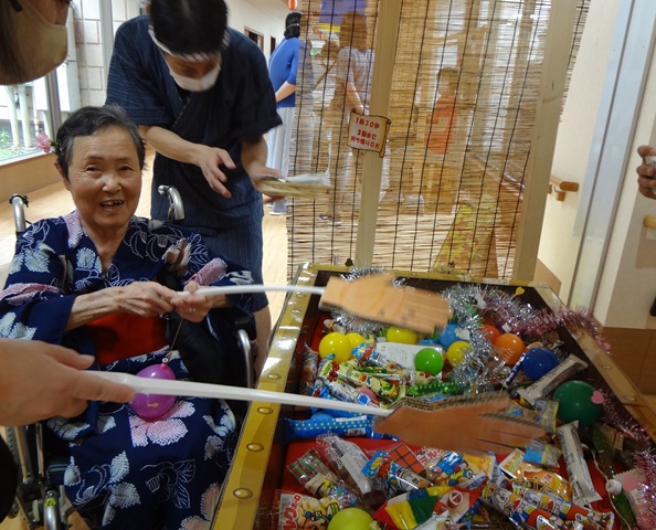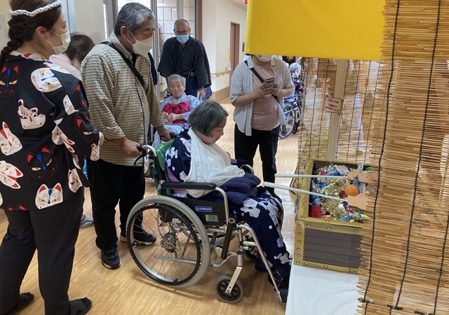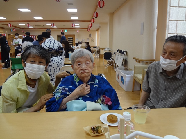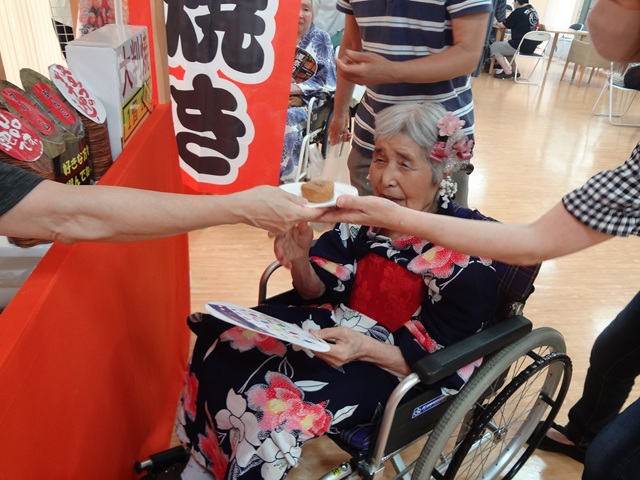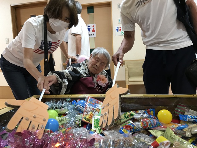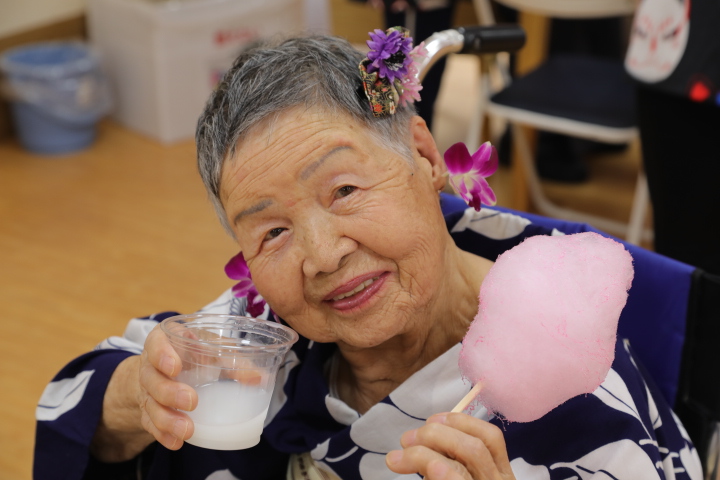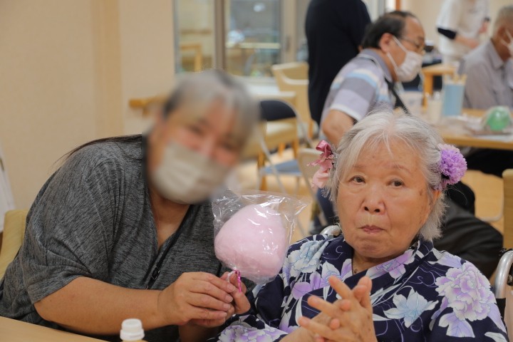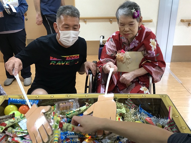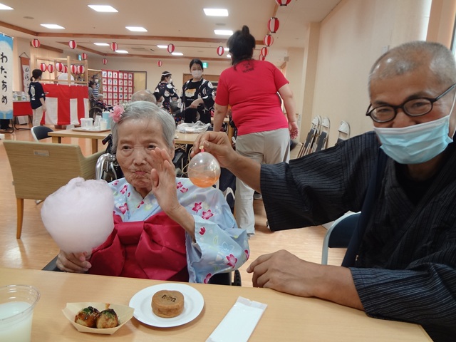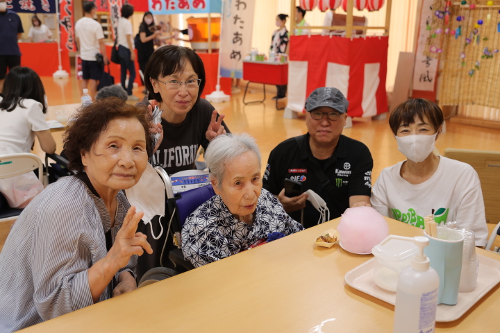 7月16日に開催した夏祭りの様子を報告致します。今年も昨年同様、感染に注意しながらご家族を招いて盛大に行いました。昔を思い出し、ご家族と一緒にお祭りを楽しんでいただきました。参加いただいたご家族の皆様、ありがとうございました。また、今年はボランティアの方をお呼びし、お祭りに参加していただきました。参加いただいたボランティアの方々、ありがとうございました。