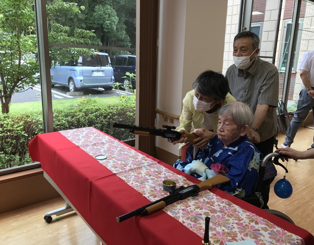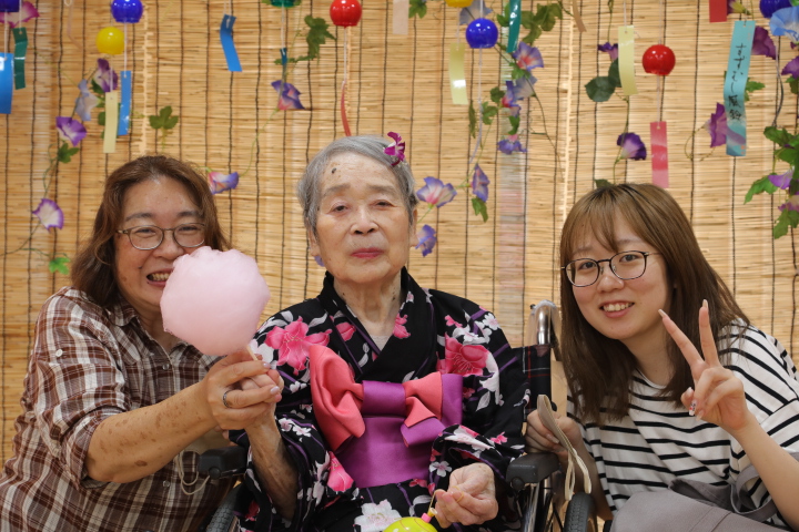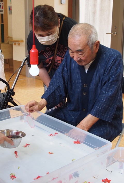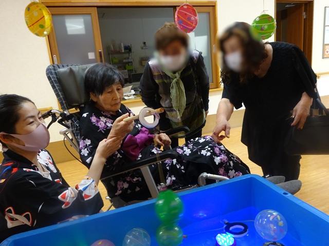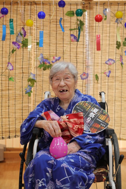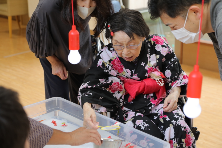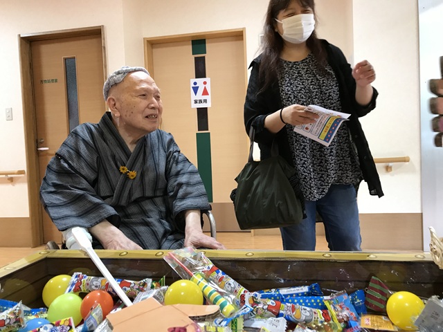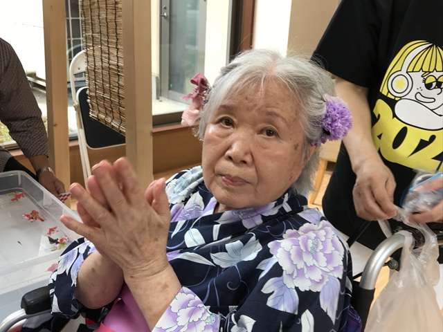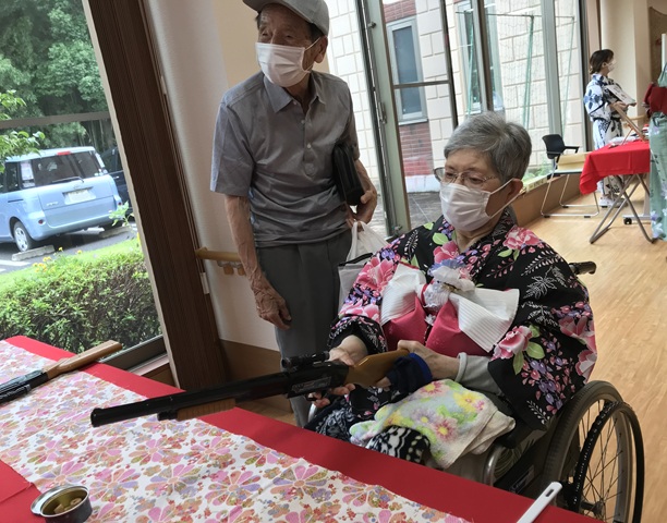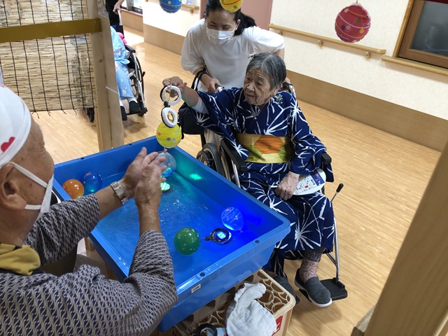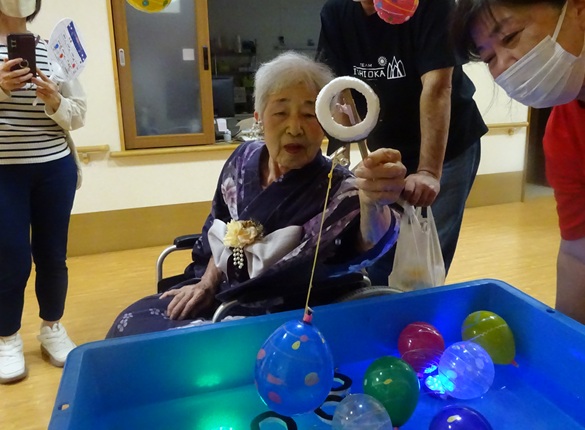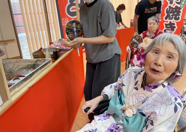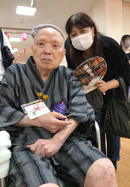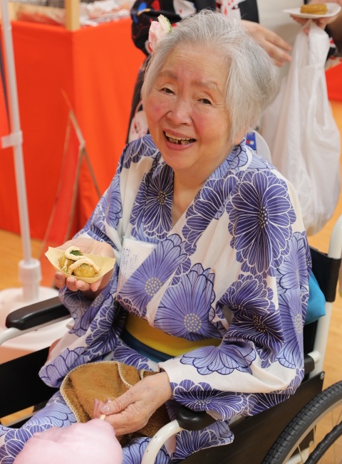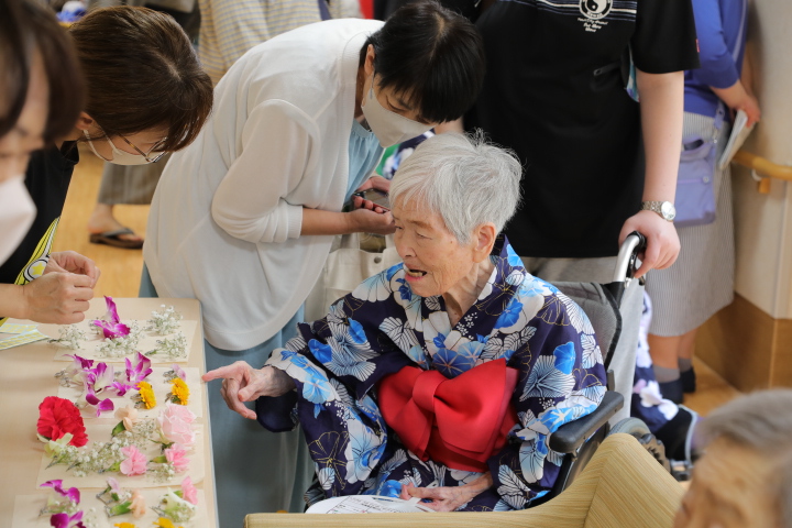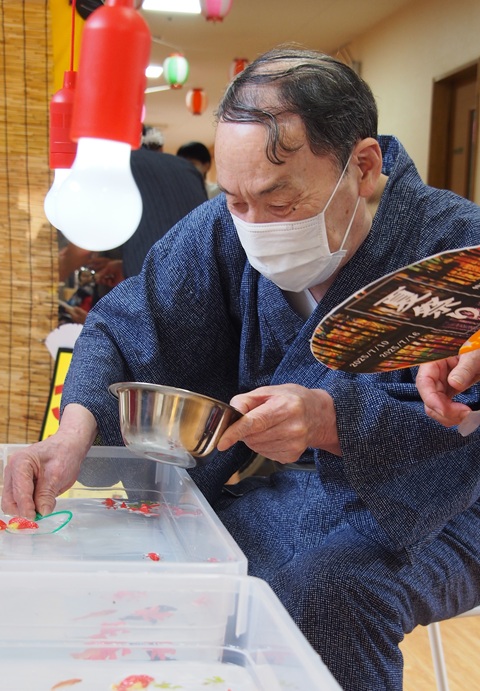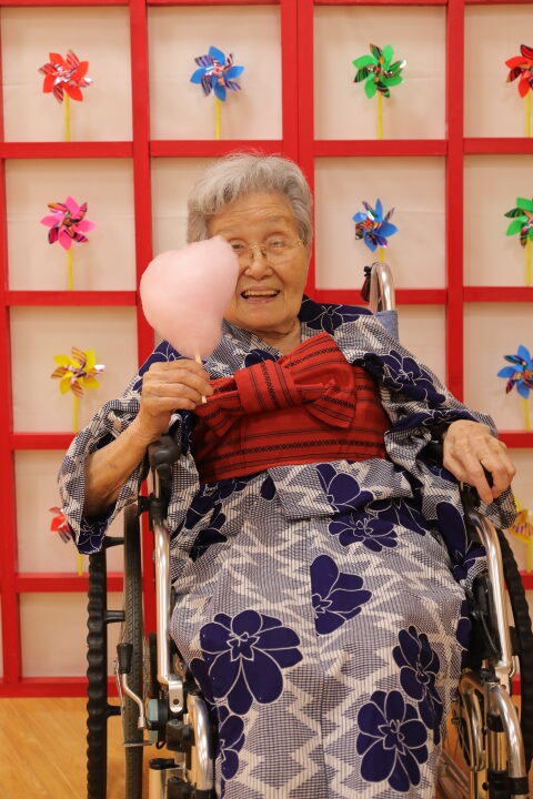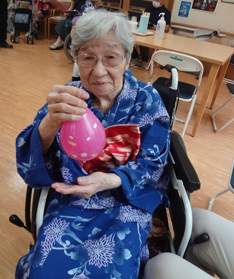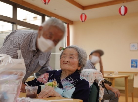 7月16日に開催した夏祭りの様子を報告致します。今年も昨年同様、感染に注意しながらご家族を招いて盛大に行いました。昔を思い出し、ご家族と一緒にお祭りを楽しんでいただきました。参加いただいたご家族の皆様、ありがとうございました。また、今年はボランティアの方をお呼びし、お祭りに参加していただきました。参加いただいたボランティアの方々、ありがとうございました。