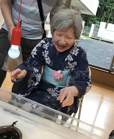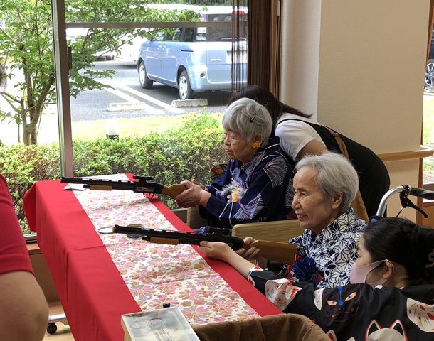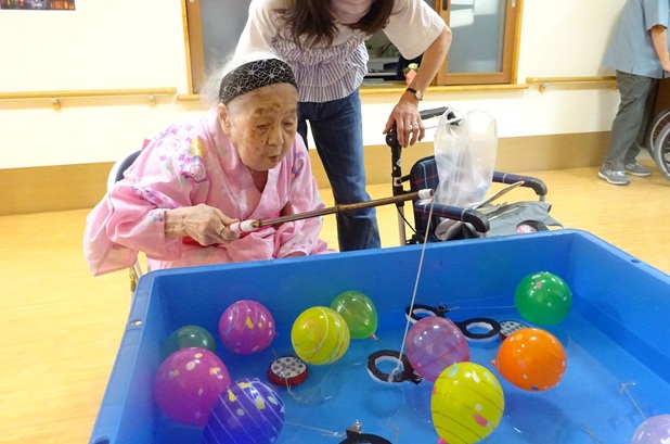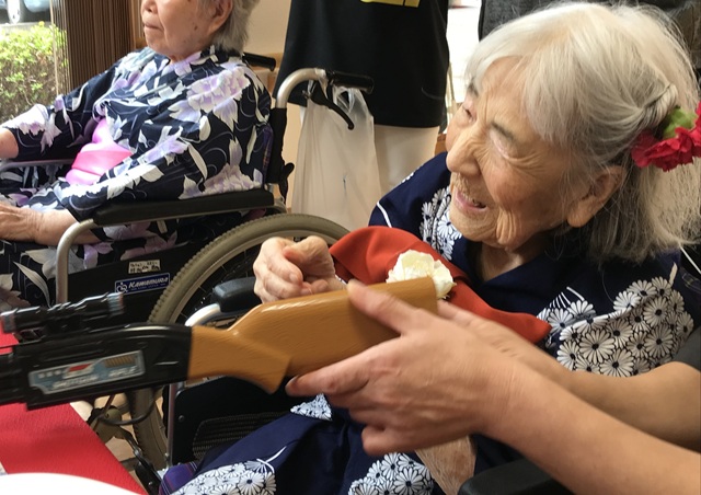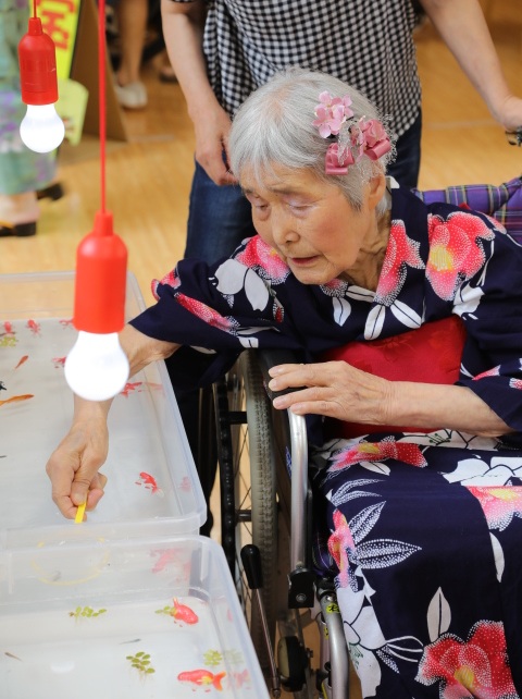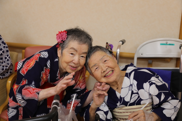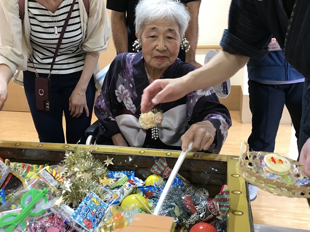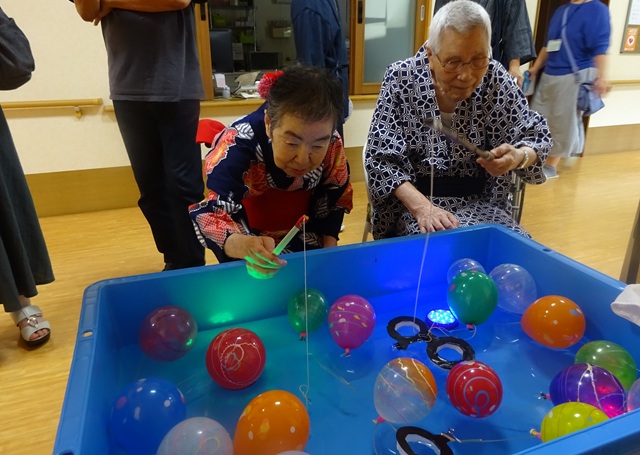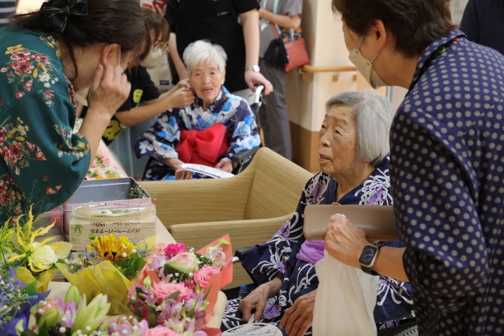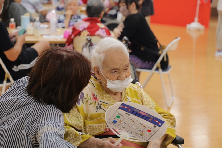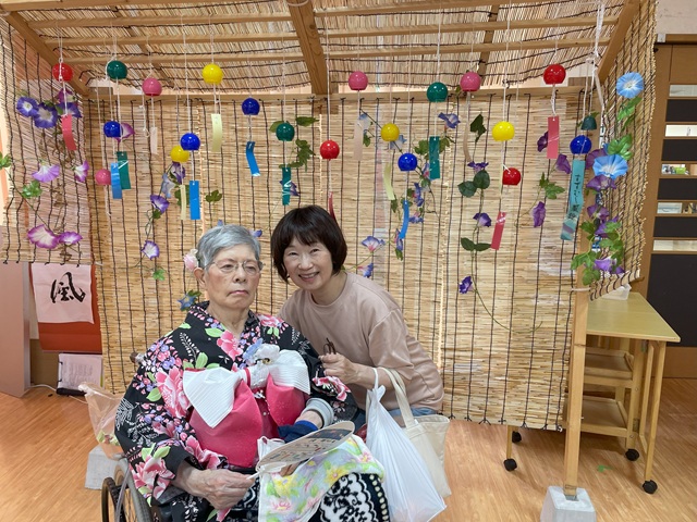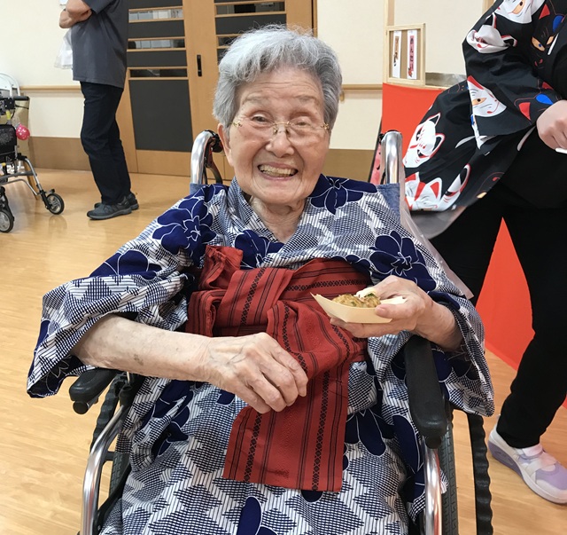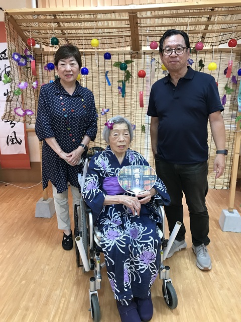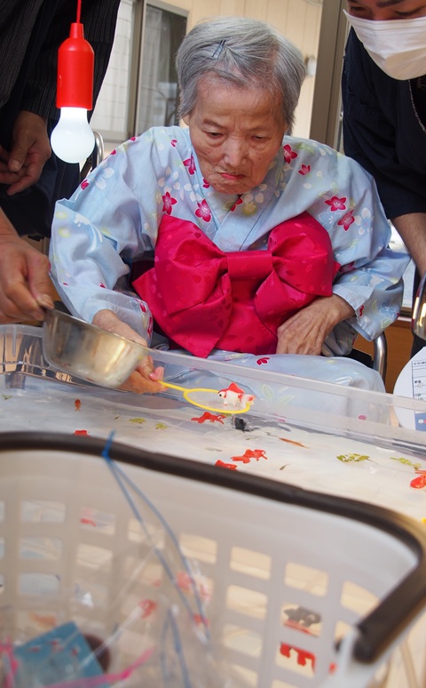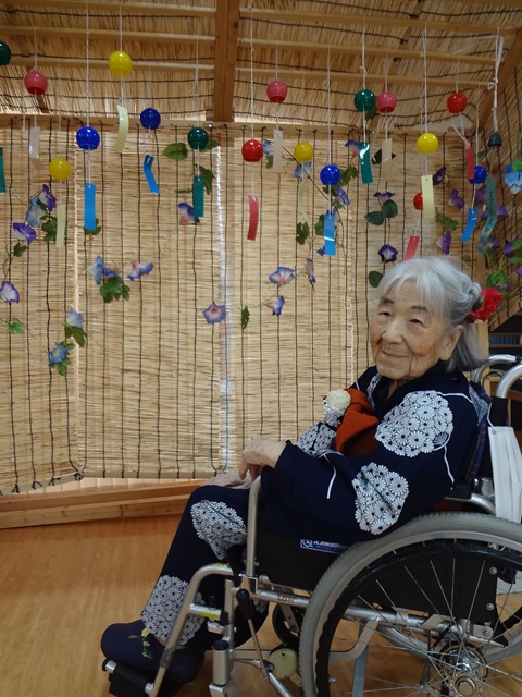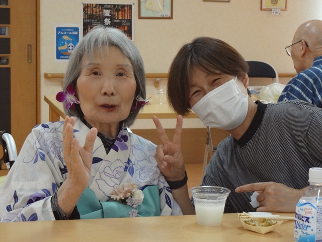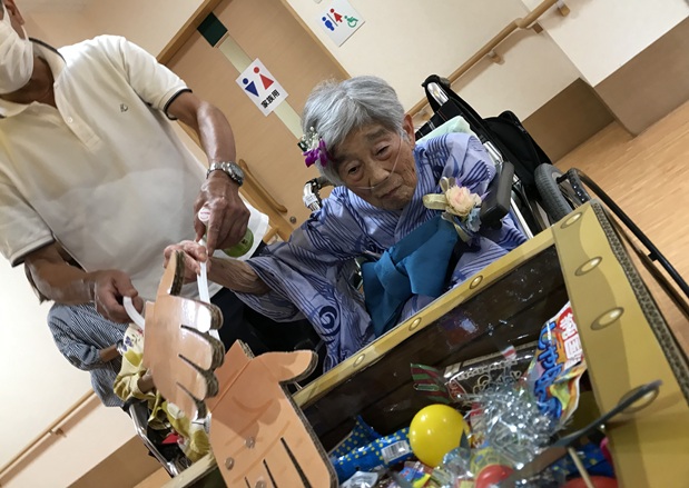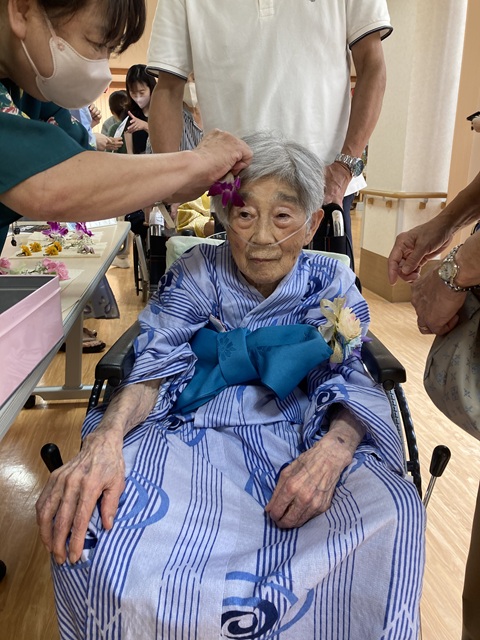 7月16日に開催した夏祭りの様子を報告致します。今年も昨年同様、感染に注意しながらご家族を招いて盛大に行いました。昔を思い出し、ご家族と一緒にお祭りを楽しんでいただきました。参加いただいたご家族の皆様、ありがとうございました。また、今年はボランティアの方をお呼びし、お祭りに参加していただきました。参加いただいたボランティアの方々、ありがとうございました。