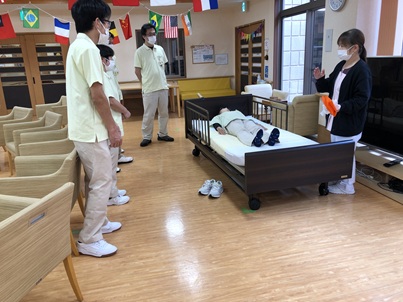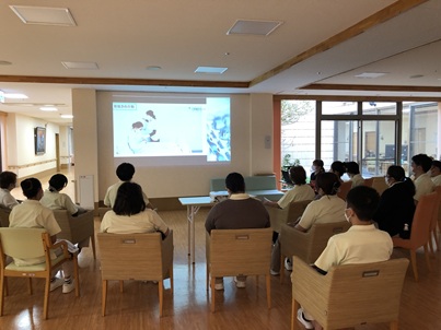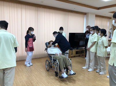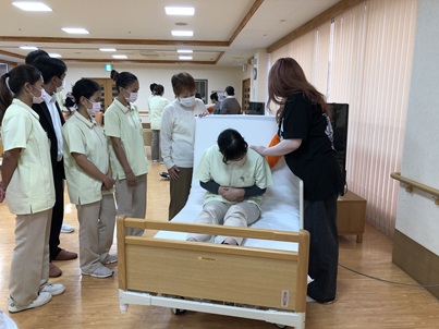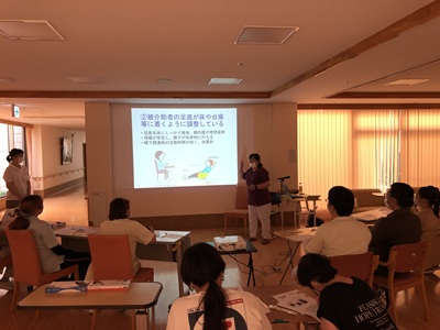 看護師が講師となり、褥瘡についての基礎知識の再確認と除圧(背抜き)体験を行いました。